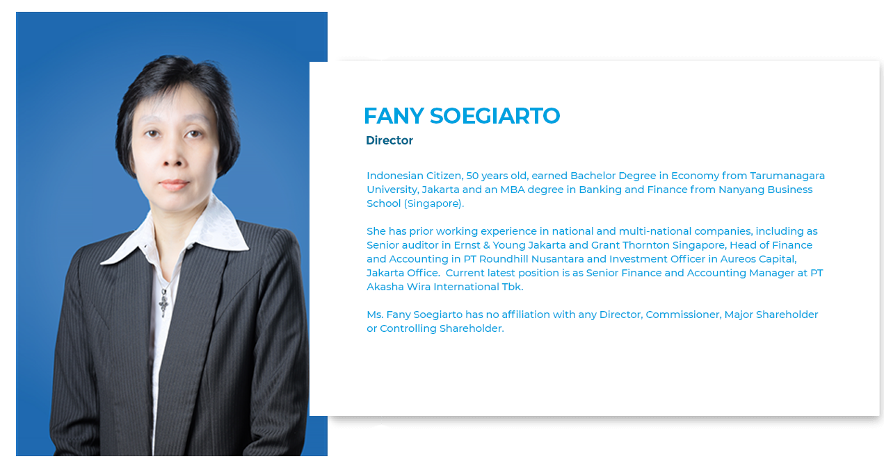 FANY SOEGIARTODirectorIndonesian Citizen, 50 years old, earned Bachelor Degree in